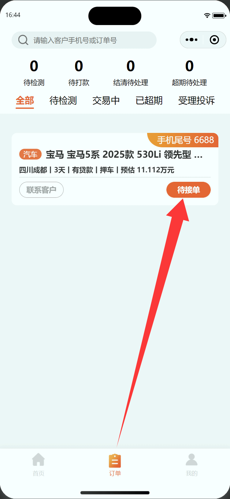 第一步,手动接单:从【订单】页选择“待接单”状态的订单点击【待接单】进入订单详情页