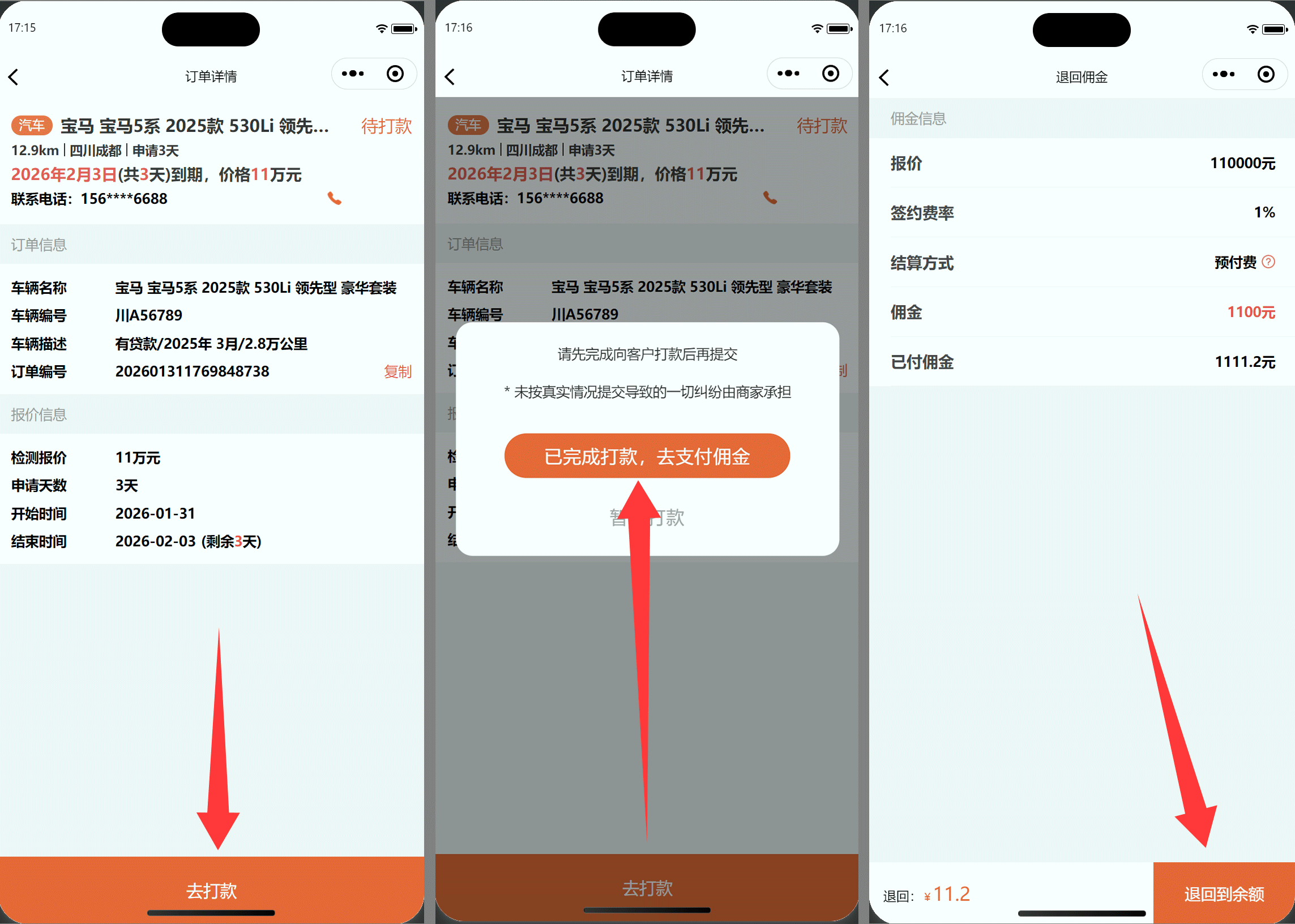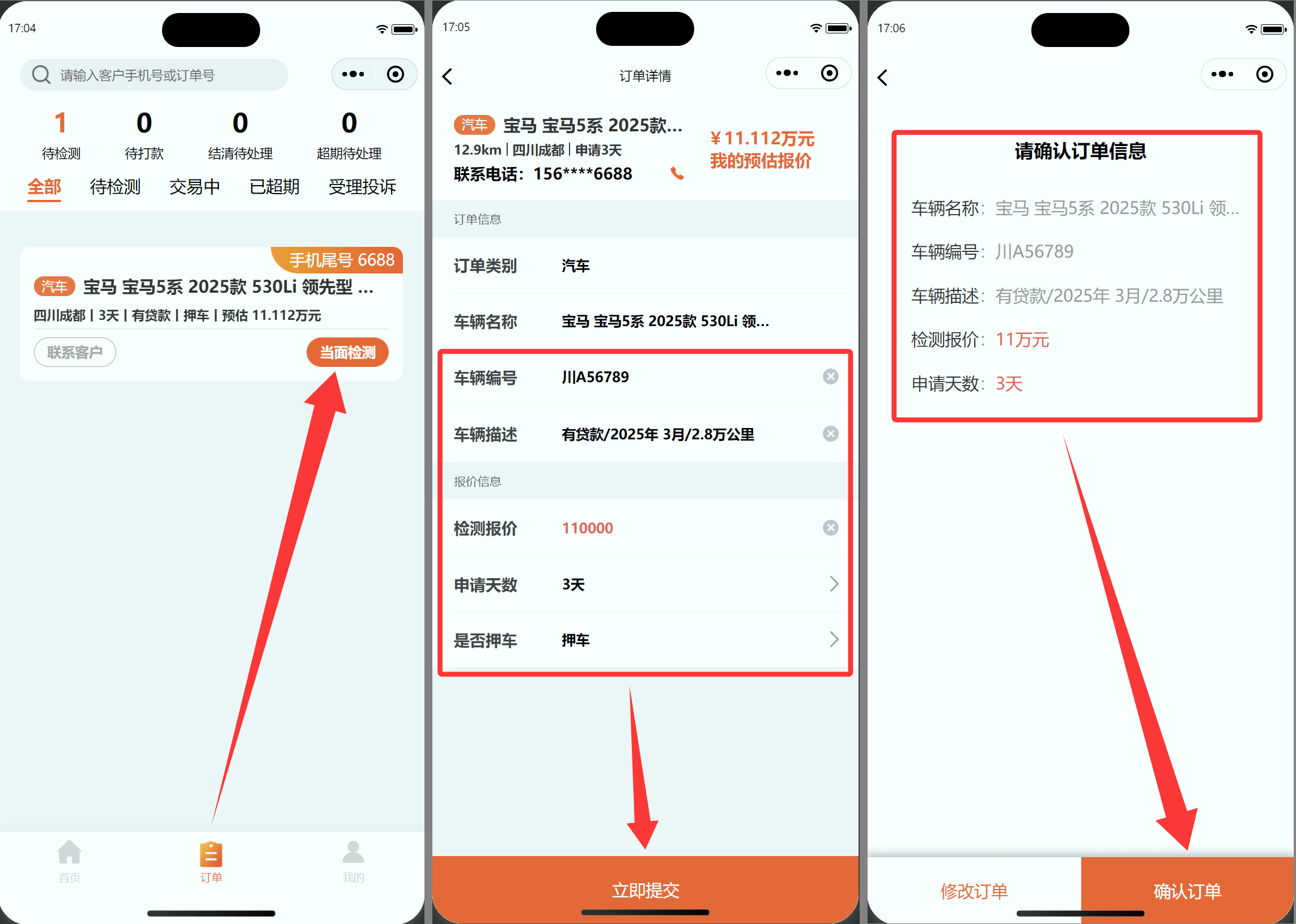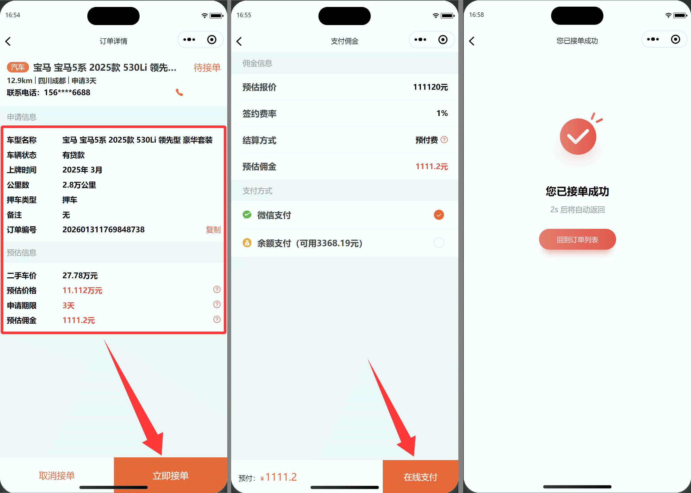 第二步,预付佣金:确认订单信息后,如有接单意愿点击【立即接单】进入预付佣金页,完成支付后即接单成功,可与客户自行预约检测方式