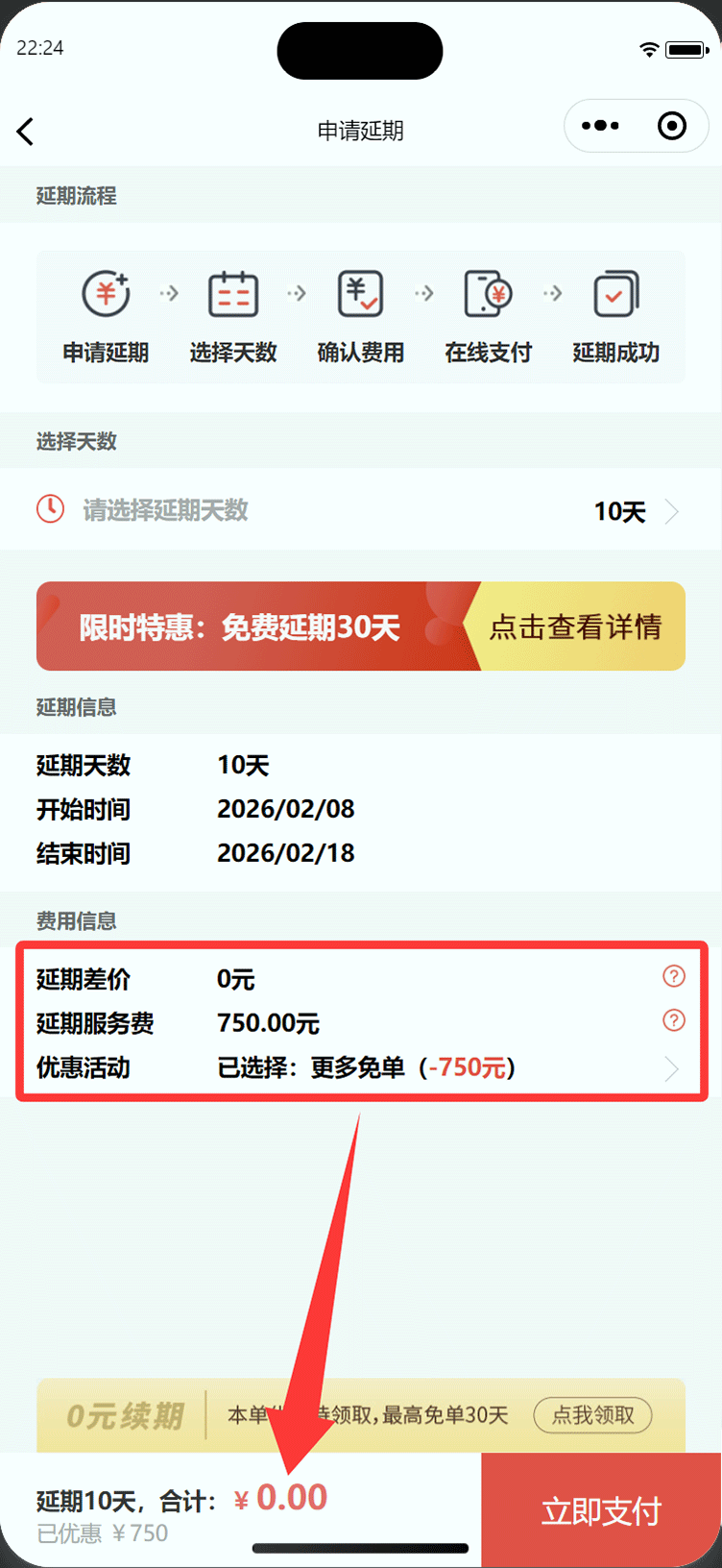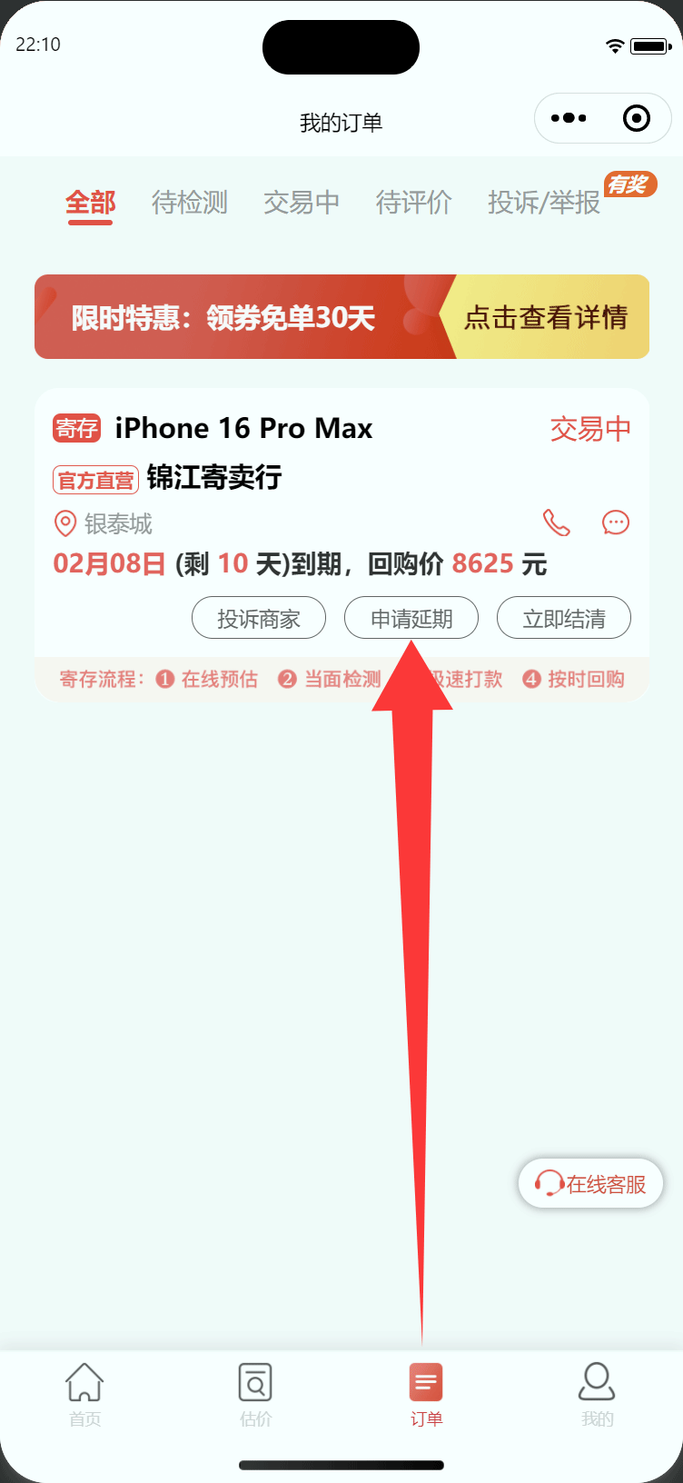 第一步,申请延期:从【订单】页找到需要办理延期业务的订单点击【申请延期】
