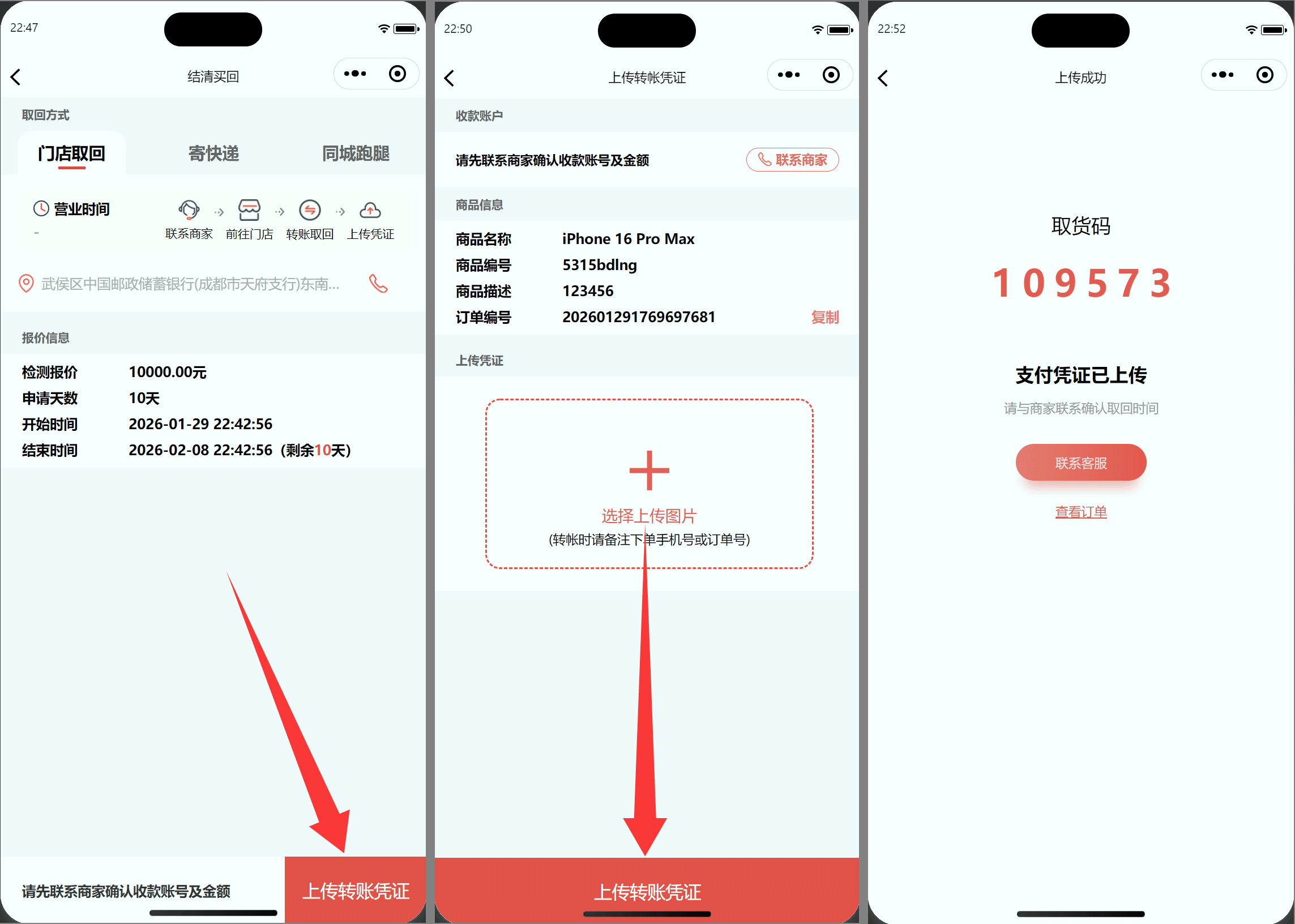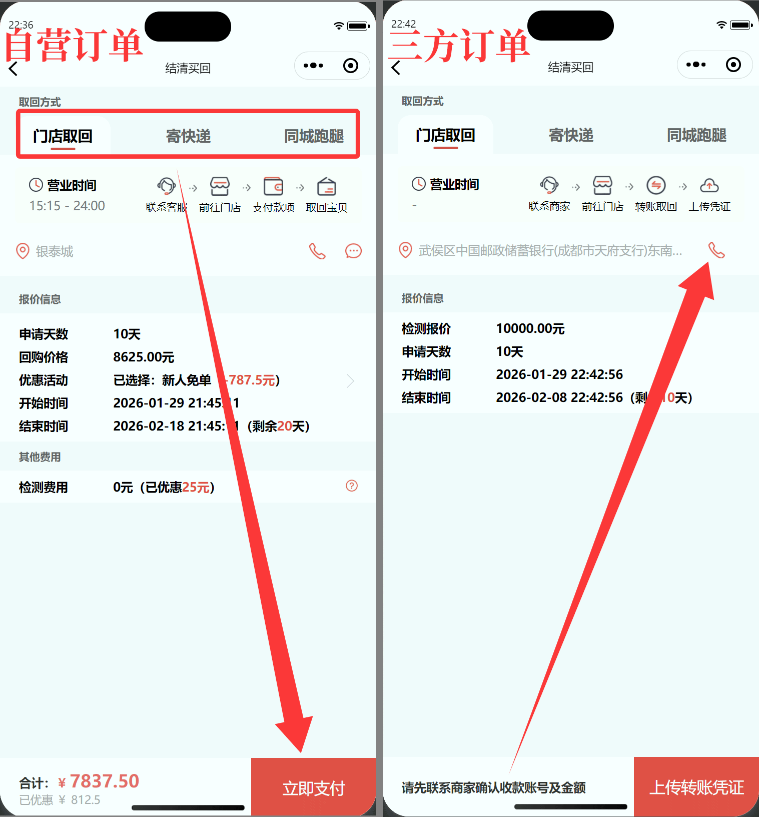 第一步,联系商家:从【订单】页找到需要办理结清买回业务的订单点击【结清买回】,自营订单可直接选择取回方式并完成在线支付、三方订单先与商家确认取回方式与款项金额